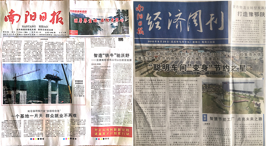 從智能制造到清潔生產、節能減排,一月內《南陽日報》于8月11日、、8月29日連續兩次報道亞澳農機,河南衛視《新聞聯播》聯動報道。