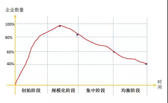 在一個行業(yè),從長期看,企業(yè)要存活下來就要有超出平均水平的成本控制能力。管理學家陳春花認為一個行業(yè)內企業(yè)數量和時間軸之間的關系可以通過四個發(fā)展階段來說明:初創(chuàng)階段、規(guī)模化階段企業(yè)數量一直上升,規(guī)模化后期企業(yè)數量達到頂峰,開始有擠出效應,約20%企業(yè)出局,到集中階段又有20%企業(yè)出局,到均衡階段還要淘汰20%,最后的競爭就在剩下的40%企業(yè)之間展開。