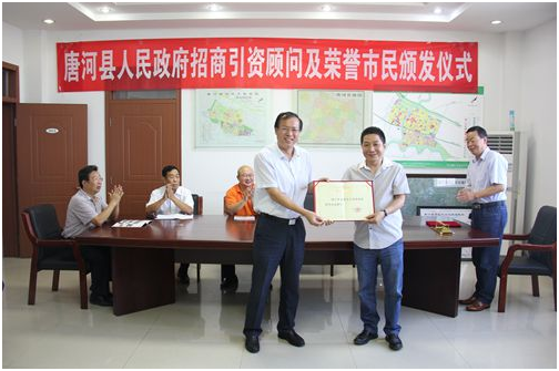 9月1日,唐河縣人民政府舉行招商引資顧問及榮譽市民頒發儀式。縣長周天龍、政府副縣長王天清、縣產業集聚區黨工委書記王全廣等出席儀式。 儀式上,周天龍為農機360網總裁吳克銘先生頒發了“唐河縣人民政府招商引資顧問”榮譽證書,為亞澳農機總經理史炳哲先生頒發了“唐河縣榮譽市民”證書和“城市金鑰匙”,并向被授予榮譽稱號的吳克銘先生、史炳哲先生表示熱烈祝賀。
